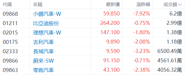 汽车股集体回落,小鹏跌近8%,长城跌超3%,祥瑞跌超2%,理思跌近2%,蔚来、比亚迪跌近1%。
