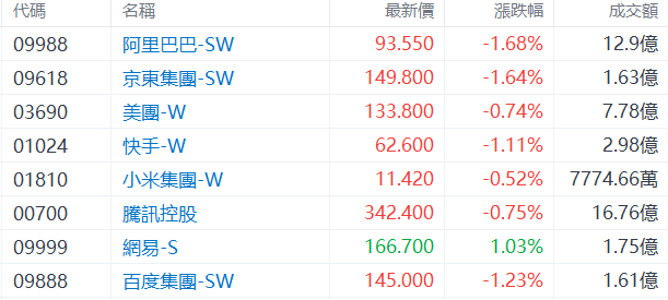 板块方面,科网股渊博回调,阿里巴巴、京东跌近2%,百度跌超1%,腾讯、好意思团跌近1%。