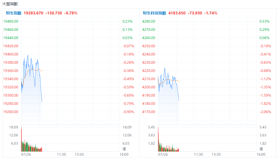 富途资讯7月26日音信,港股当天低开低走,收尾发稿,恒指跌0.78%全球足球注册人口,科指跌1.74%,国指跌1.32%。