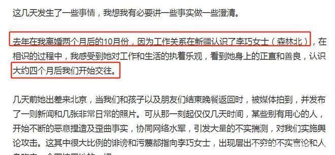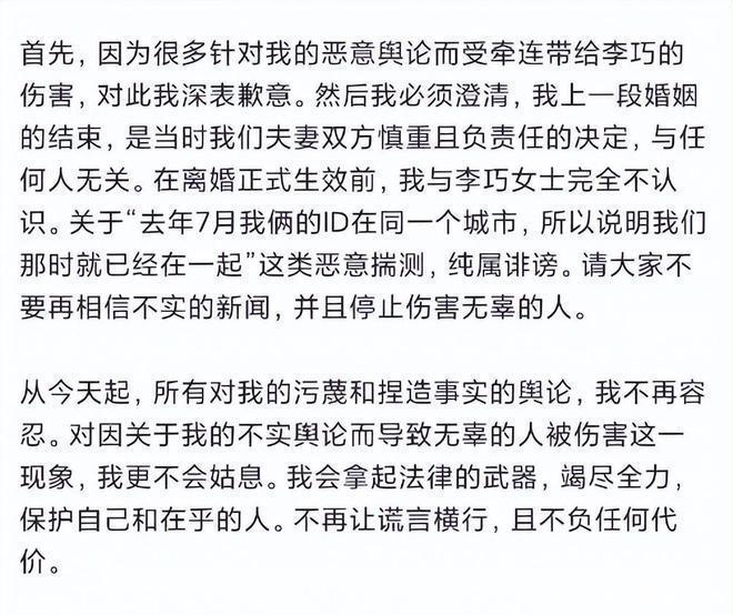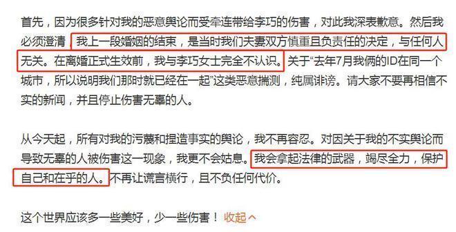 既领略了我方并非婚内出轨的传说,也夸赞了李巧,还阐发了她并非小三,一篇官宣恋情的小作文被他硬生生搞成了“自我诡辩”小作文,精心良苦啊。