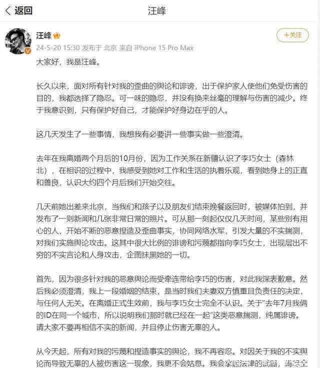 汪峰也承认那天照实是和丛林北在沿路吃饭被东谈主拍到,因为对她形成了许多负面影响,汪峰本东谈主对此相称的愁肠。汪峰此次发文相称要点的场地是,他强调他们两个是在我方离异以后才意志的,十足不存在婚内厚实的事情,请人人不要诬蔑他。