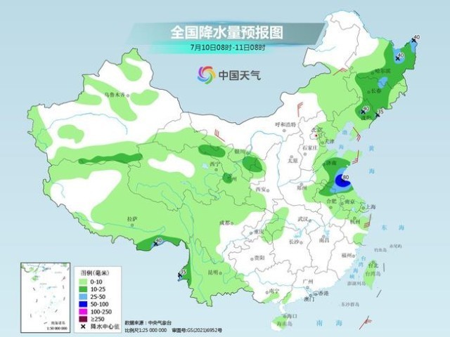 其中今天,黑龙江中东部、吉林、辽宁东北部、山东中南部、江苏北部、安徽北部、云南西部、西藏东南部等地的部分地区有中到大雨,其中,山东东南部、江苏北部等地局地有暴雨(50~80毫米)。