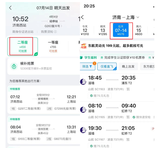 以济南-上海为例,7月14日,乘坐从济南西站到上海站的高铁二等座票价为453元,而覆没天,由山东航空执飞的济南遥墙到上海虹桥的经济舱需要678元,还需要再付80元的机建燃油用度。而在时候上,乘坐高铁需要3-4小时,飞机需要一个半小时,接头到安检时候及班次互异,飞机的时候上风并不赫然。