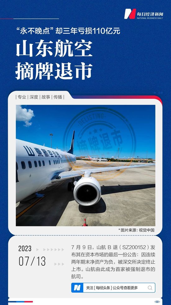 7月9日,山航B退(SZ200152)(以下也称“山航”或“山航股份”)发布了其在本钱市集的终末一份公告:因联贯两年期末净金钱为负值,山东航空股票被深交所决定收场上市。
